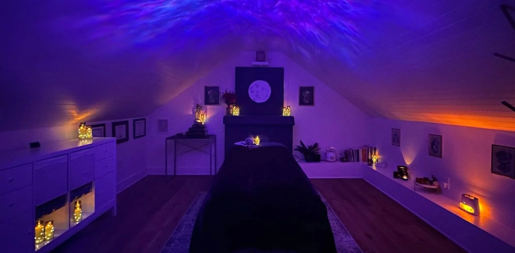Our studio isn’t just peaceful — it’s immersive. A soft, otherworldly glow and intentional ambiance invite you to drop into deep rest from the moment you arrive. You’ll leave not just feeling better, but moving and living more freely.